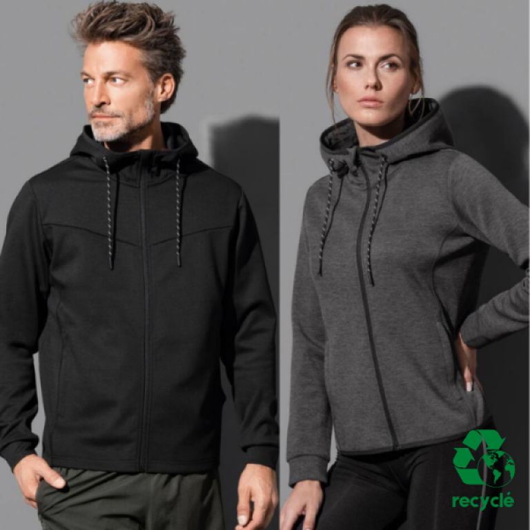Veste de sport à capuche en polyester recyclé en modèle homme et femme.